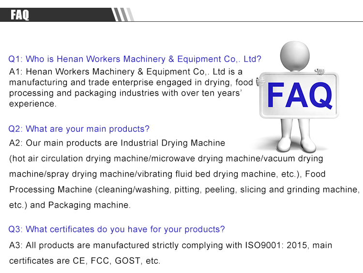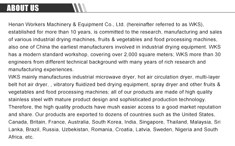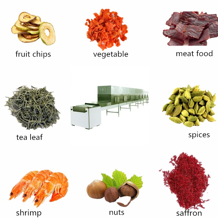 4, Mildew-proof, sterilization, preservation: microwave drying functions with thermal effects and biological effects, can achieve mildew-proof and sterilization at lower temperature. High speed and short time drying maximize the preservation of the activity of the material and food vitamins, the original color and nutrients.