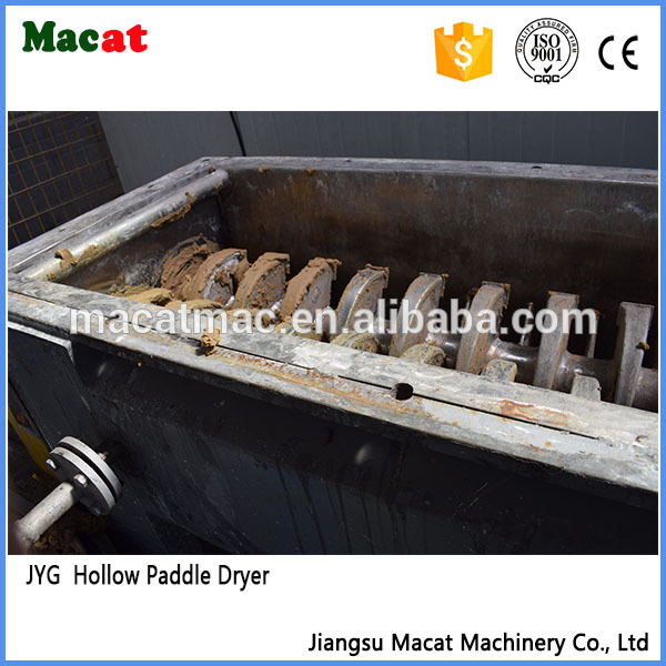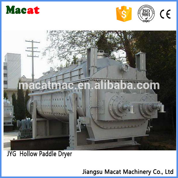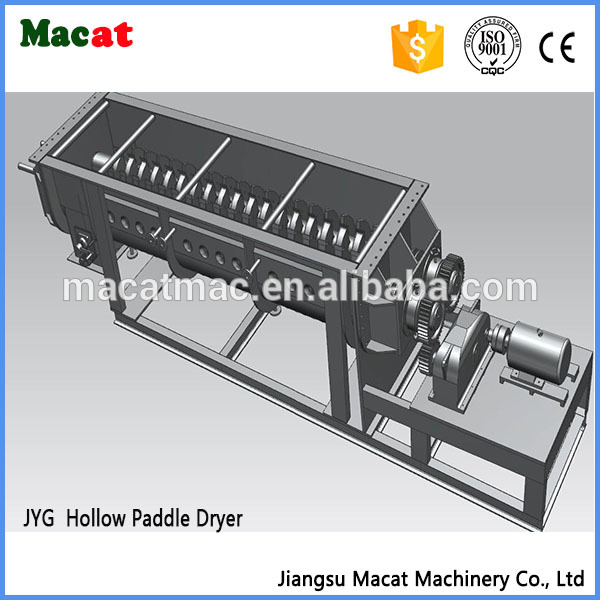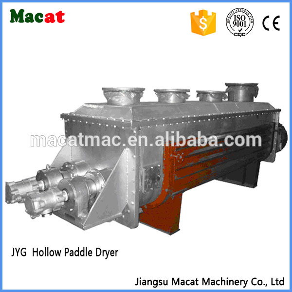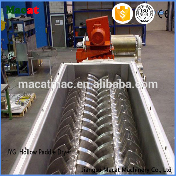 Hollow chock shaped blades are concentrated on the hollow shaft. Heat media flow through the blade from the hollow shaft. The heat transferring area in the effective volume is very high. The temperature range of heating media is -40 ℃to 320 ℃ . It might be steam, or liquid state, such as steam, thermal oil etc. Indirect heating, there's no heat carried out by air. All heat is utilized for to drying the material except the lost of heat insulation layers. The surface of chock shaped blade has self-cleaning function. The relative movements of the product particles and the chocked shaped surface might clean the material attached to the chock shaped surface, so to keep the cleanliness of heat transferring surface during working. The shell of hollow blade dryer is Ω shape. 2 or 4 pieces of hollow stirring shaft are usually equipped in the shell. To avoid any leakage of material, there're sealed terminal cover and top cover with the shell. The heat transferring media flow through the rotation connector, jacket's shell and hollow stirring shaft. To ensure best transferring effect, the hollow stirring shaft adopts different interior structure in accordance with different heating media.