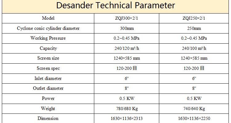 The desander is a cyclone sand remover consisting of a desander cyclone and a vibrating screen. It is a secondary solids controlled desanding equipment for the treatment of suspended drilling fluids. It is mainly used for the separation of solid particles with a particle size of 47 to 76 μm in the drilling fluid.