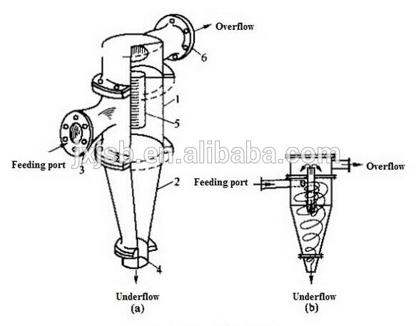 1. Cylinder 2. Cone 3. Feeding pipe 4. Underflow port 5.Overflow pipe 6. Overflow pipe port