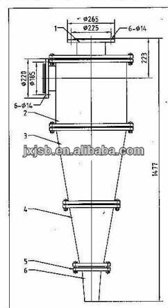 The cyclone desander is mainly applied to the process of second paragraph grinding, coarse or concentrate re-grinding and the closed-circuit composed by mechanical grading machine, its grading operation is according to the particle size. The device has features of simple structure, long service life, large disposal capability, small land covering and no driving power consumption. It is a high efficient grading and de-sliming equipment of fine -particle material. It is widely used in concentrator of nonferrous and ferrous, chemical, pharmaceutical, ceramics and other industries.