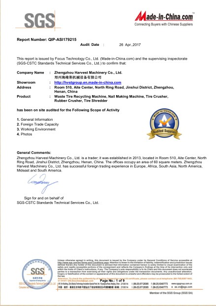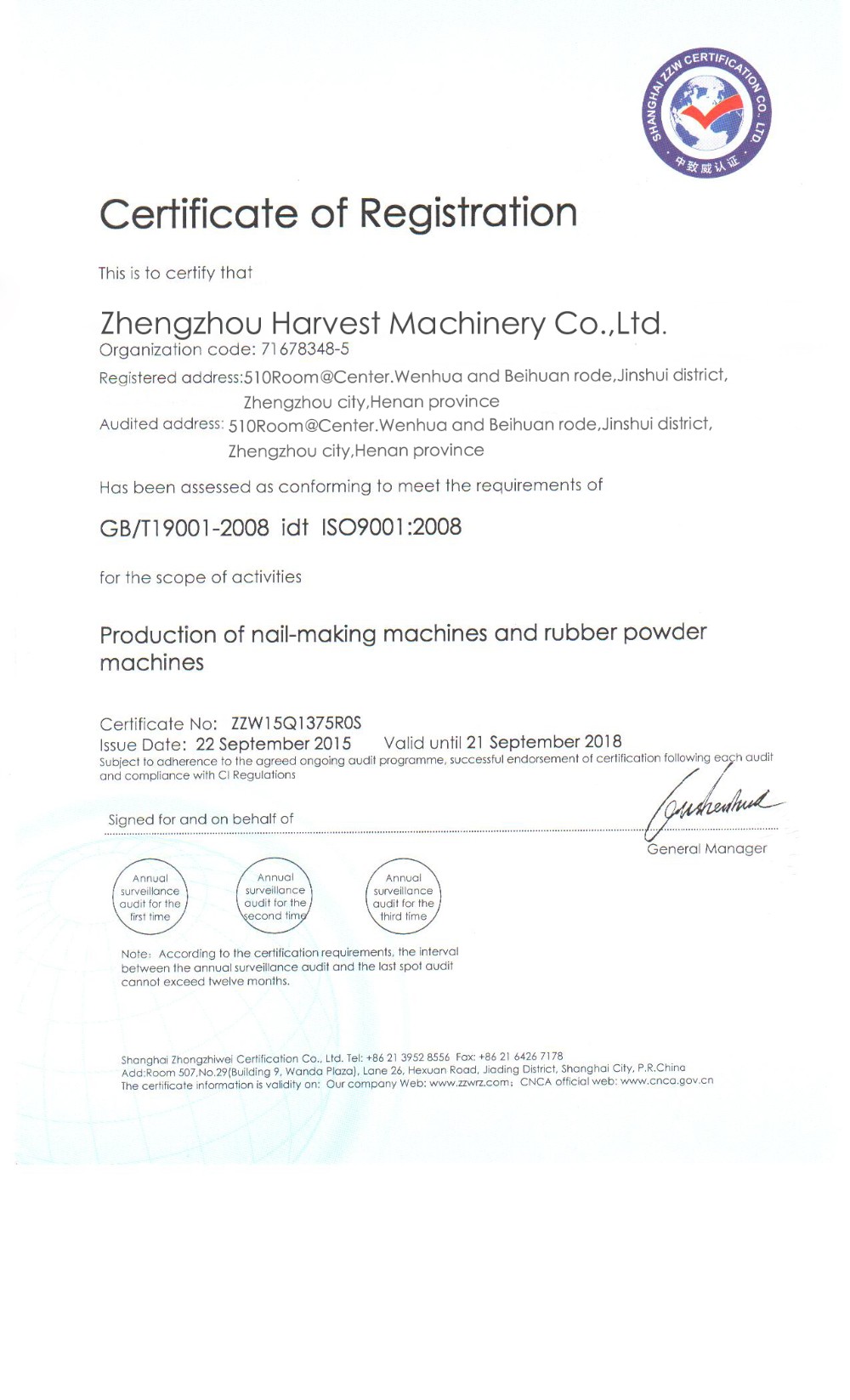 Zhengzhou Harvest Machinery Factory was established in 1987,it's one of the earliest professional manufacturers of nail making machine and tire recycling machines.With advanced production experience,first-class management technology and the professional after-sale service team,our products not only occupythe domestic market, but also export overseas continuously,which has received unanimous praise from our clients.Our factory always aims to put customers' needs at first place,and has consistently tried to upgrade its products for more than 20 years. The main products now , nail making machine and tire recycling production line , have already obtained good market for their high quality and reliable technology.