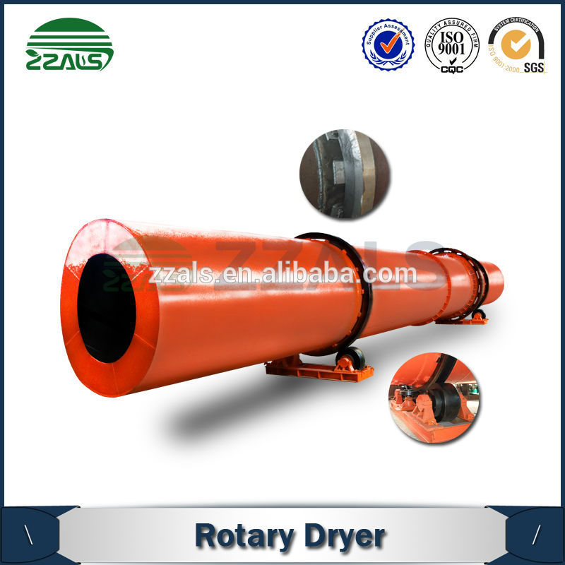 The rotary drum dryer for sale is mainly composed by the revolving body, lifting plate, driving device, supporting device, sealing ring and other components. So it has the advantages of reasonable structure, perfect in workmanship, high yield, low energy consumption, convenient to operate.