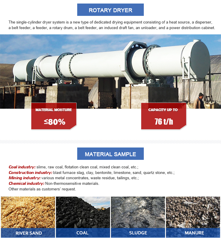 Product DescriptionStructure & PincipleTechnicle parametersSIZE(m) (Dia.*L)Volume (m³)Capacity (t/h)Obliquity (%)Highest inlet air temperature (℃)Power (kw)Total weight (t)Φ1.2×8.09.01.9~2.43~5700~8007.59Φ1.2×1011.32.4~3.03~5700~8007.511Φ1.5