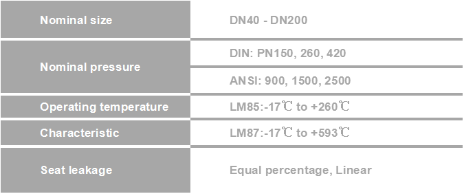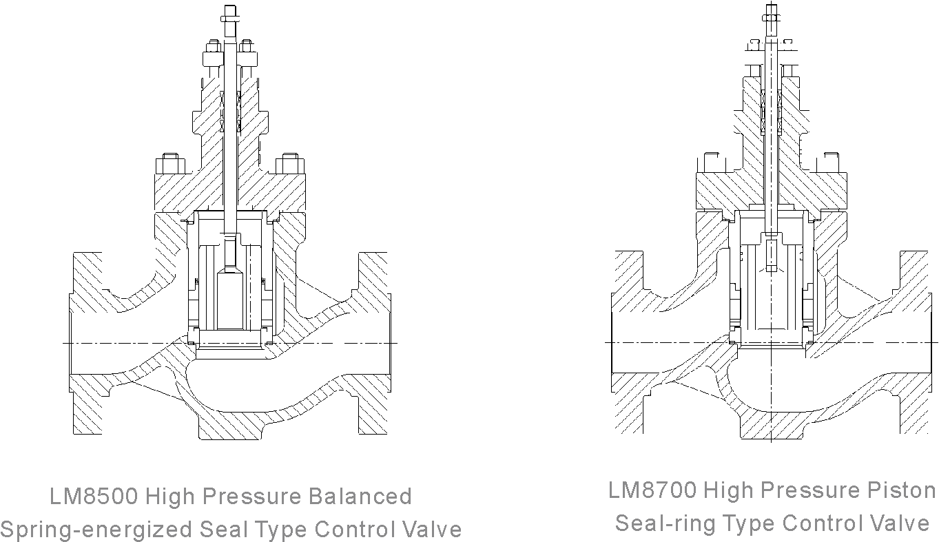 LM85/87 series cage guided high pressure balanced control valves are characterized by super dynamic stability, large allowable on-off pressure differential and smaller thrust force. All using three-piece separated cage combined optional spring-energized seal type or piston seal type take on excellent control precision and higher seat leakage rate. The temperature range varies with the sealing of different structures. They are best suitable to large pressure drop ratio, wide temperature change and high pressure conditions.