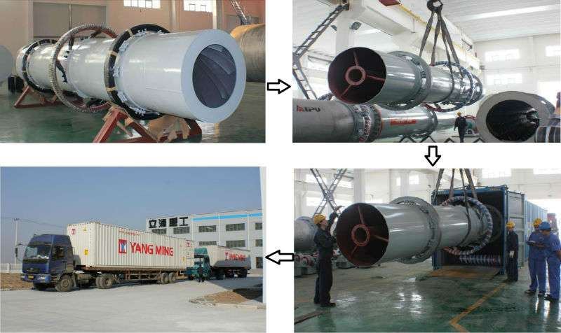 Materials are sent to hopper of rotary dryer by belt conveyor or bucket elevator.The barrel is installed with slope to horizontal line. Materials enter the barrel from the higher side, and hot air enters the barrel from the lower side, materials and hot air mix together. Materials go to the lower side by gravity when the barrel rotates. Lifters on the inner side of barrel lift materials up and down to make materials and hot air mix completely. So drying efficiency is improved.