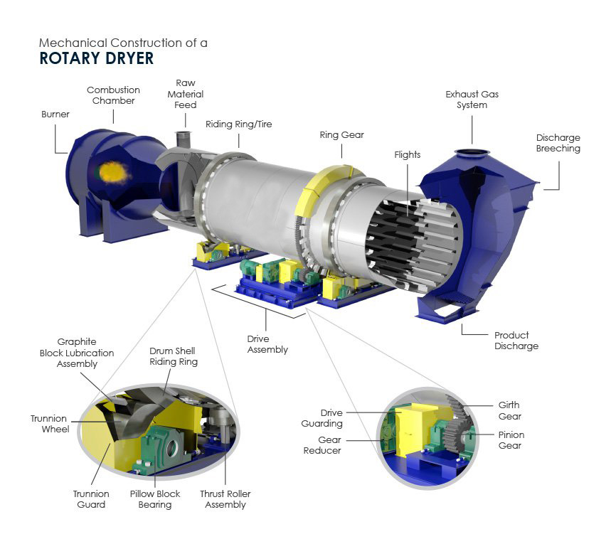 The Rotary Dryer is made up of Direct or Indirect Biomass Stove, Main Rotary Drum Body, Screw Conveyor, Cyclones, Air-locks, Fans and matched Pipes which can realize to reduce the moisture from 60%-10%.