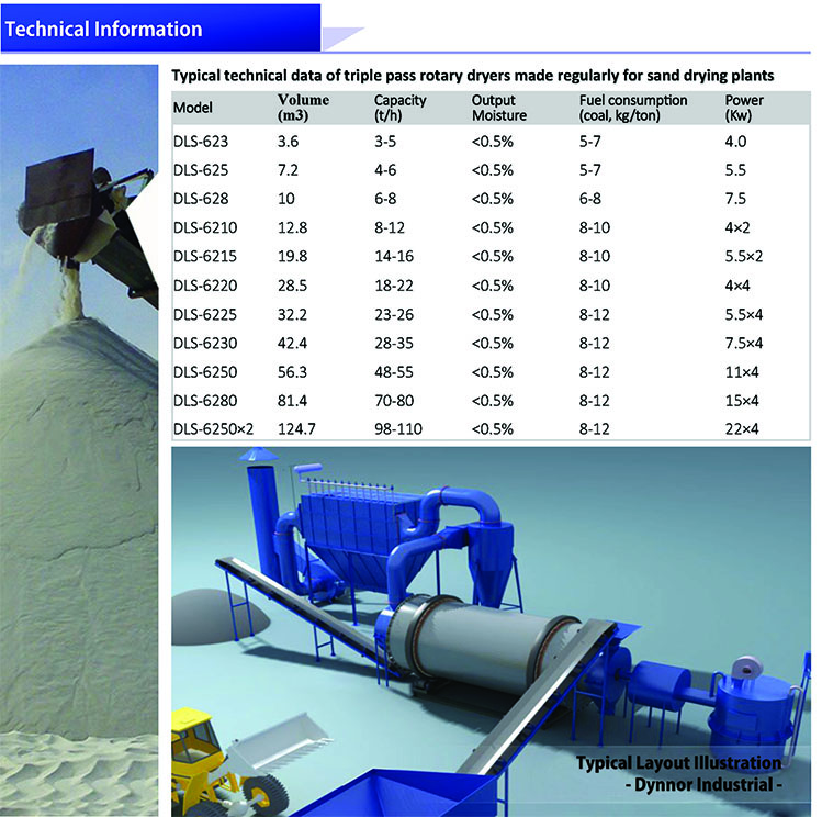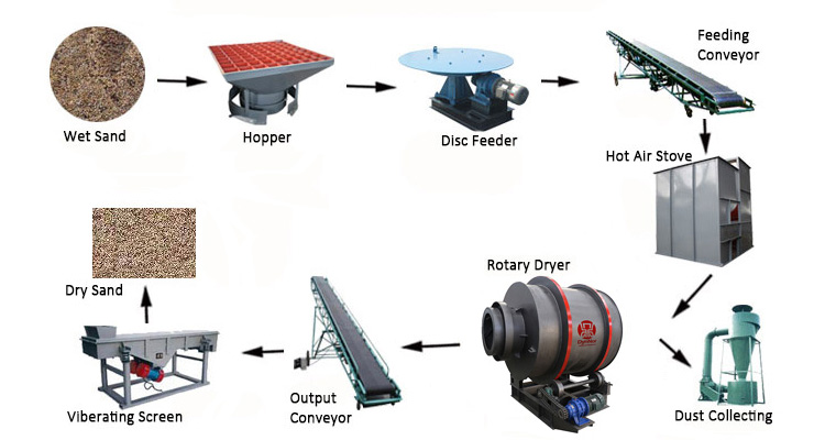 River sand is conveyed by belt conveyor or bucket elevator to the hopper, and then the hopper feeder through feeding chute into the feed end of dryer. The feed chute slope should be greater than the natural inclination of materials, so that the material flow into the dryer smoothly. Dryer cylinder is a flat line with water slightly tilted into the rotation of the cylinder, materials from high end to join, heating medium from low-end to enter, and material into a counter-current contact, there is also a heating medium with materials and flow into the cylinder. With the rotation of the cylinder material by gravity Run to the bottom on the lower side, wet material in the process of cylinder body move forward, directly or indirectly get the heating medium for heat, to dry the wet material, and then by the belt conveyor or screw conveyor at the discharge end.