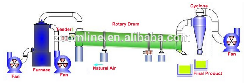 In high-speed transmission and dispersion of heat flow, make the wet material moisture evaporation, get the process of dry powder or granular products. Mainly by the air heater, feeder, air drying tube, cyclone separator, fan, etc. The dryers are widely used in machinery, straw briquette fuel, charcoal wood pellet fuel, sawdust briquetting, agricultural engineering, etc. Such as drying of biomass straw, wood drying, drying of wood shavings, sawdust drying agricultural fiber materials such as drying.