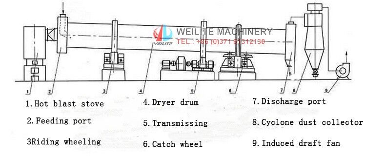 The wet material is put into the dryer after dehydration. The material can disperse evenly and contact fully with the hot air in the dryer through the stirring of the plate which is in the roller . Materials go to the lower side by gravity when the barrel rotates. Lifters on the inner side of barrel lift materials up and down , make materials and hot air mix completely.