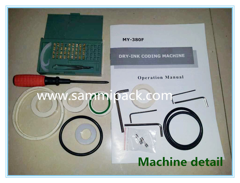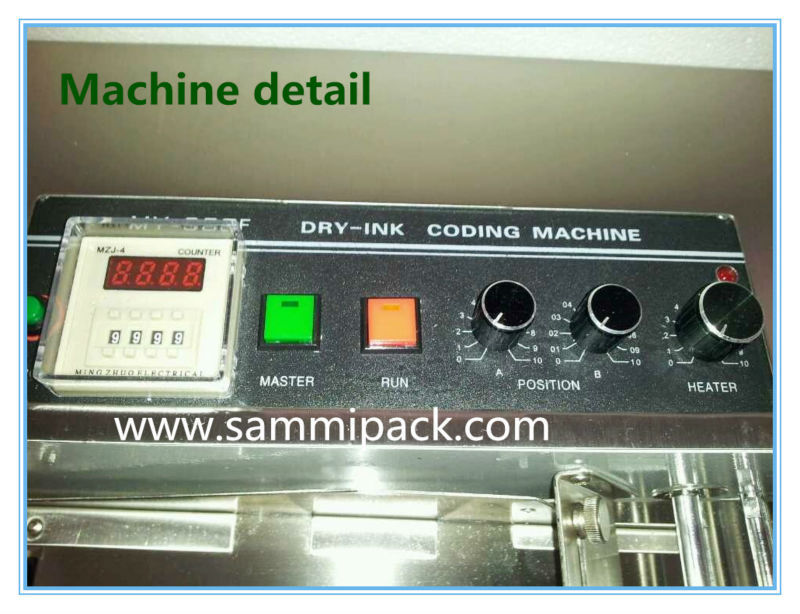 MY-380 Automatic dry-ink coding machine suits for printing labels on the surface of paper, non-ferrous plastic film and aluminum foil. It applies advanced dry-ink roller for printing and can make the words be printed clearly and uneasy to decay and change. The letters/numbers sizes of this coding machine are available with 2mm, 2.5mm, and 3mm. You can choose the size you want. ..