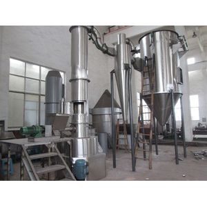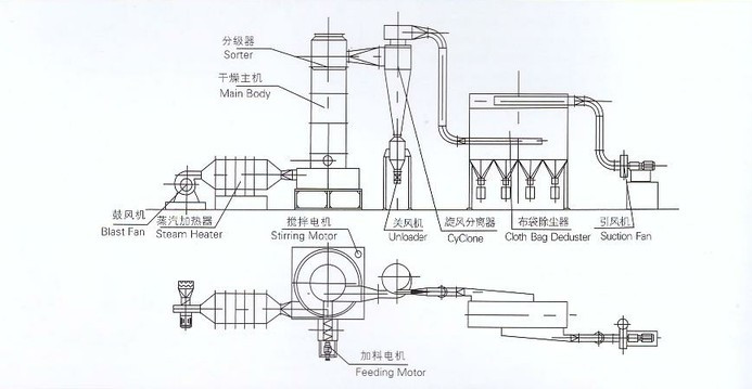The material with High speed rotary motion under the impact of airflow and drive dispersed quickly. However the big size granulate and wet particular clusters cannot crush with high speed rotary motion, so it will fall into the crushing plant under the effect of gravity forcibly broken and particulates. and then with the high speed air flow going up and finish the drying process.