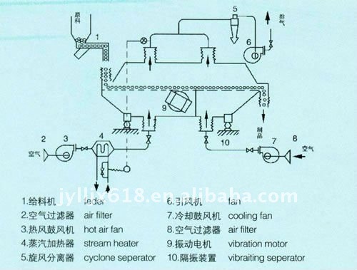 Raw material is fed into the fliud bed dryer from the inlet and moves forward continuously along with the level of fluidized-bed under the action of vibration.The hot air passes through fluidized-bed and carries out heat exchange with damp raw material.Then the damp qir is exhausted out through cyclone separator and duster the dry raw material is discharged through discharge outlet.