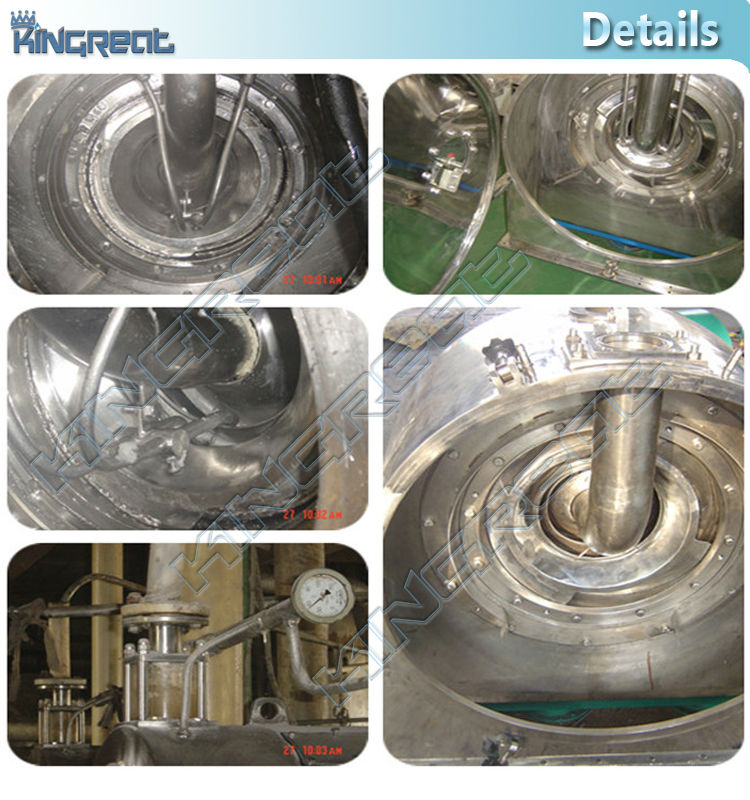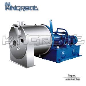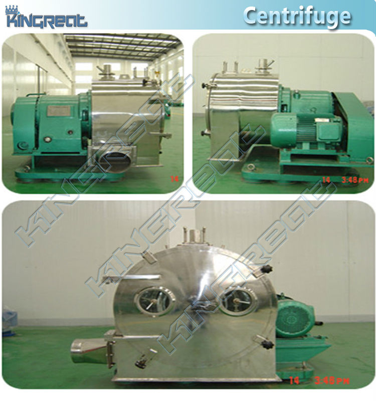 Model PWC centrifuge machine is a type of horizontal, spiral discharging filtrating equipment with continuous operation. With the drum and the helix rotating in the same direction at high speed difference, the material is continuously led, via the feeding pipe, into the inner cylinder of the spiral feeder and, after acceleration, enters the drum. Under the action of the centrifugal force field, the liquid phase passes through the filtrating medium and is discharging out of the machine, while the solid-phase material is retained inside the drum and forms the filter residue. Under the combined action of the conic surface component force of the centrifugal force and the spiral feeder, the filter residue continuously moves towards the big end of the drum and is discharged out of the machine through the discharging trough. This machine is capable of continuous feeding, separating, washing and discharging during the full-speed running. It has such features as compact structure, small space occupancy, continuous operation, smooth running, strong adaptation, large handing capacity, low moisture content in the filter cake, etc.