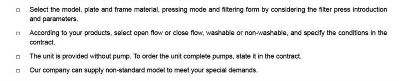 Filter presses can be divided into plate and frame type and are used for solidliquid separation of various suspending liquid in intermittent pressure filtration. Filter plates are pressed by pressing devices and suspending liquid is pumped into the filter chamber. Solid particles and separated through filter cloth. The products are simple in structure but good in separating effects, convenient in use, and widely applicable to mining, metallurgy, petroleum, chemical, medicine, textile, printing and dyeing, paper making, foodstuff, alcohol, inorganic salt, coal washing, dyestuff and sewage treatment industries.