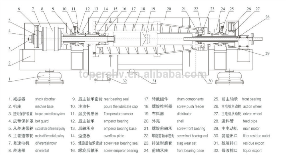 There is spiral which is the feeding spiral which is has the same axis with the drum.The spiral and the drum rotate in different speed but in the same direction.The rotate difference is caused by the differential.The suspension enters the spiral through the feeding pump in the centre, when it starts to speed up the material goes into the drum.Under the effect of the centrifuge force, the relatively heavy solidoid sediments into slag blanket on the surface of the drum wall, then the spiral push the slag blanket to the drum cone section for further dehydration, latter it will be discharged from the small section slag hole.While the relatively light liquicdoid forms the inner liquid cycle, and it will be discharged from the large end overflow gate.