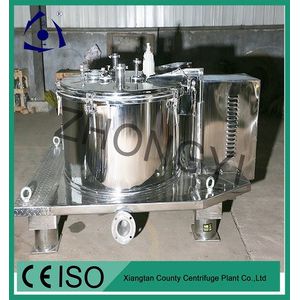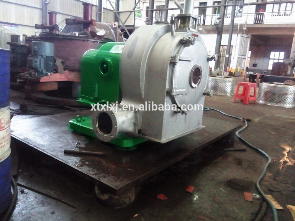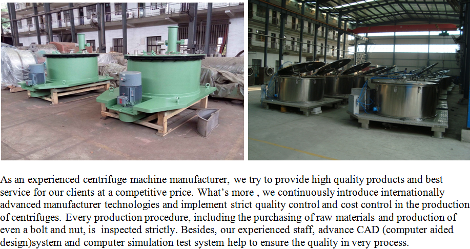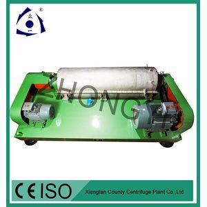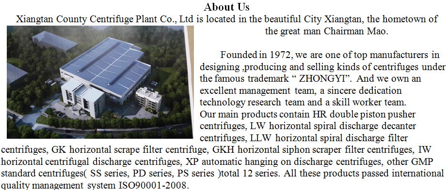 The motor drives the basket as well as the feeding spiral in the same vertical line at different high speed. The materials to be separated go continuously into the feeding pipe and distribute on the wall of the bowl, under the action of the centrifugal force, the liquid goes through the bowl, while the solid staying the bowl form the filter residue . and it goes continuously through the basket and move out of the machine under the combined action of the conic surface component force of the centrifugal force and the spiral feeding pipe.