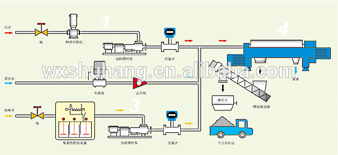 The centrifugal sludge dewatering machine can achieve the integration of three functions: sludge thickening, sludge dewatering and thickened sludge dewatering. The concentrate dewatering system is consists of 5 parts: (1) sludge feed system, (2) flocculants dosing system;(3)concentrate dewatering system;(4) mud cake delivery system: (5)Serial system electrical control. To adapt to different targeting customers, we provide two different serial system electrical controls; (1) summary type: automatic control in operation; (2) General type: PLC control