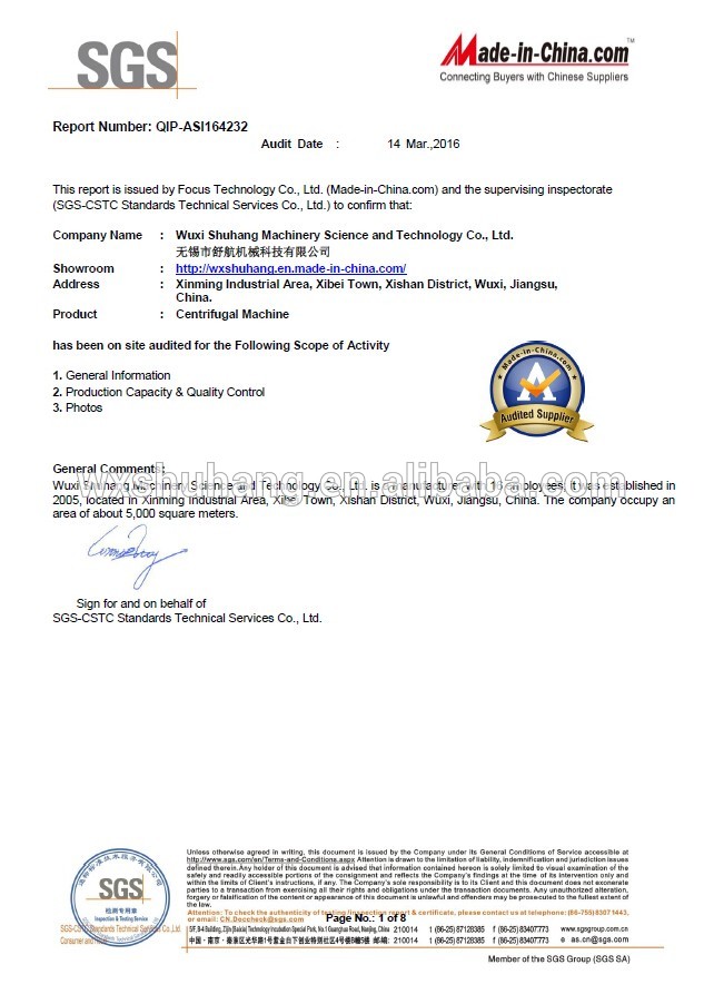 Wuxi ShuHang Machinery Science And Technology co.,ltd is located at Xinming Industry Park of Xibei Economic Development Zone which is adjacent to the new mainline of Beijing-Shanghai High-speed Railway and Huning Expressway with convenient traffic. The company is a high-tech enterprise with more than 10,000 square meters area processing workshop that is professional in the integrated development design, processing manufacture and project installation of chemical, foodstuff, pharmaceutical and environmental protection machineries whose core technology and major products are major series products of horizontal spiral decanter centrifuge,Three-phase Separation Horizontal Screw-discharge Sedimentation Centrifuge, complete set of sludge dewatering equipment, PP Melt Blown Filter Cartridge,Active carbon filter device, PP filter cartridge machine.