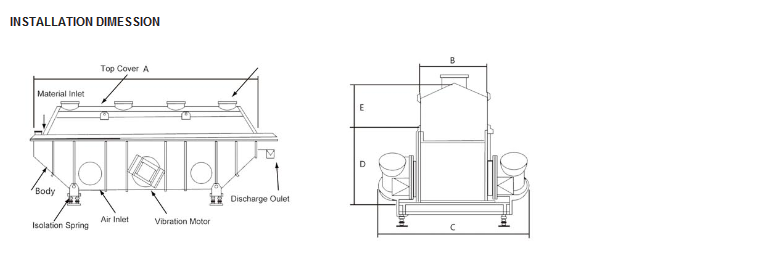 The raw material is fed into the dryer from the feeding inlet and the material will continuously moving along with the fluidized bed level under action of vibration. The hot air passes through fluidized bed and carries out heat exchange with damp raw materials. The wet air is exhausted out by the cyclone separator and the dried material will be discharged from the discharge outlet.