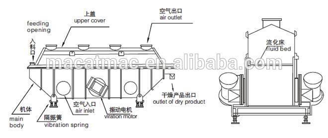 Material is fed into the dryer from feeding port, under the action of vibrating force, material moves forward with the fluidized state continuously along the horizontal direction. Hot air passes through fluid bed from bottom to up and does heat exchange with damp material. After the powder is collected by cyclone separator, damp air is exhausted out. Dried product is discharged from discharging port.