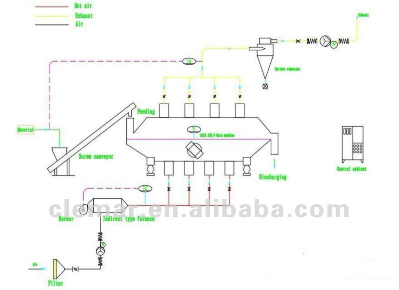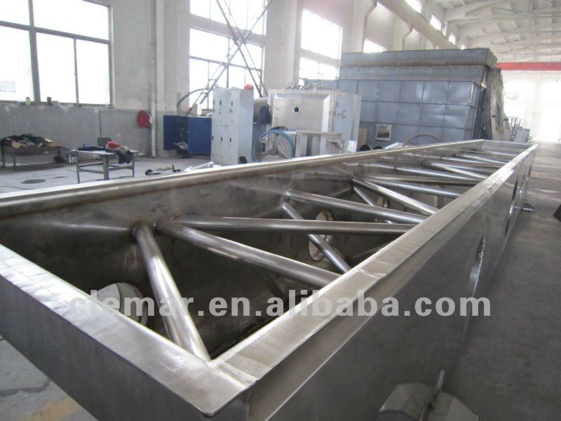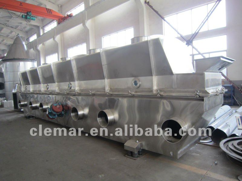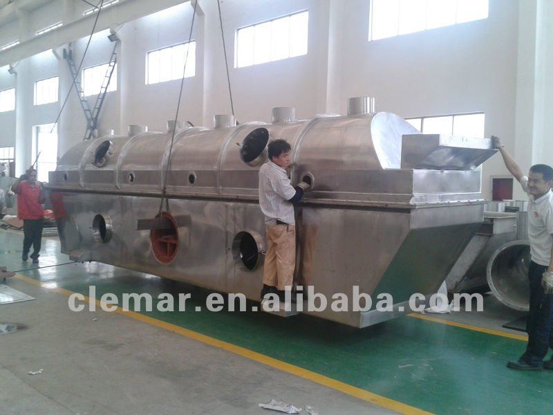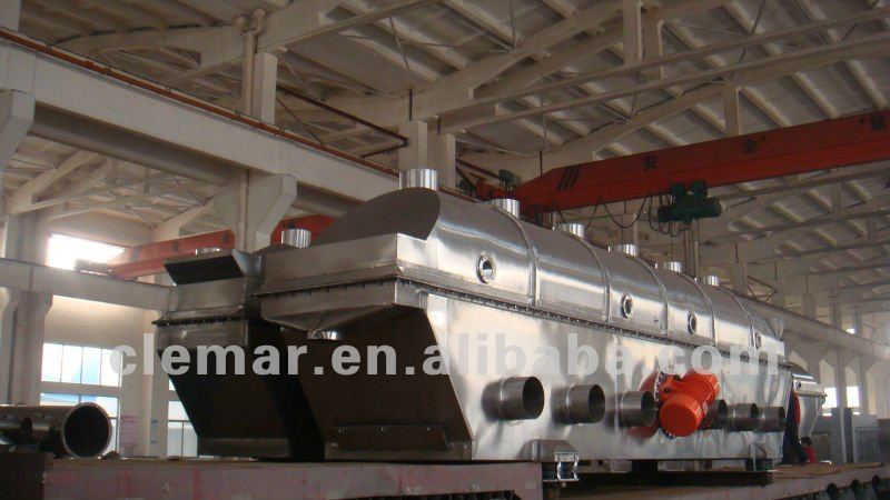 Vibrating fluid bed dryer is widely used for operation of drying, cooling and damp increasing (or carry out at the same time) for powder or granule materials. Material is fed into the machine from feeding inlet, and moves forward continuously along with the level of fluid bed under the action of vibration force. Hot air passes through fluid bed and carries out heat exchanging with damp material. Then the damp air is exhausted out by exhaust fan, some fine powder is collected by cyclone separator and dust remover, and dried product is discharged from discharging outlet.