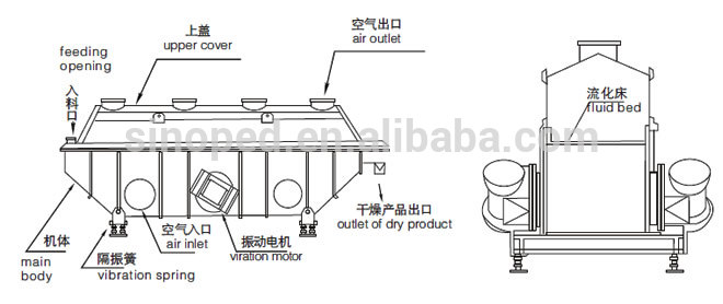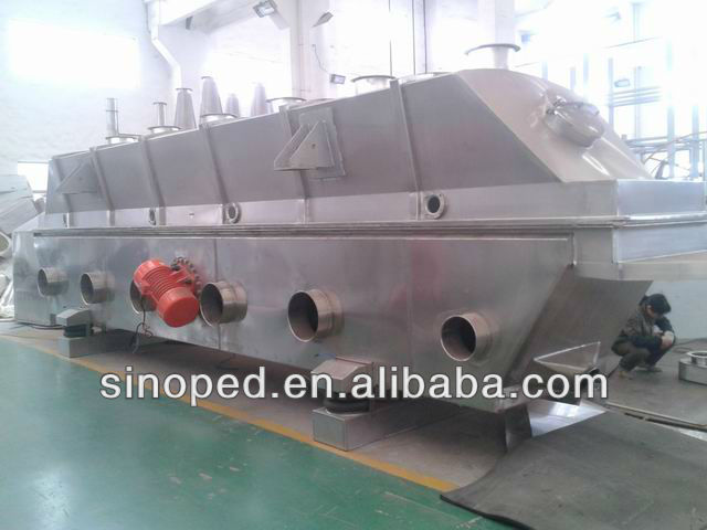 Vibrating malic acid fluid bed dryer is widely used for drying, cooling and damp increasing (or carry out at the same time) for powder or granule materials. Material is fed into the machine from feeding inlet, and moves forward continuously along with the level of fluid bed under the action of vibration force. Hot air passes through fluid bed and carries out heat exchanging with damp material. Then the damp air is exhausted out by exhaust fan, some fine powder is collected by cyclone separator and dust remover, and dried product is discharged from discharging outlet.