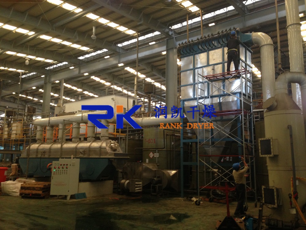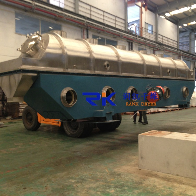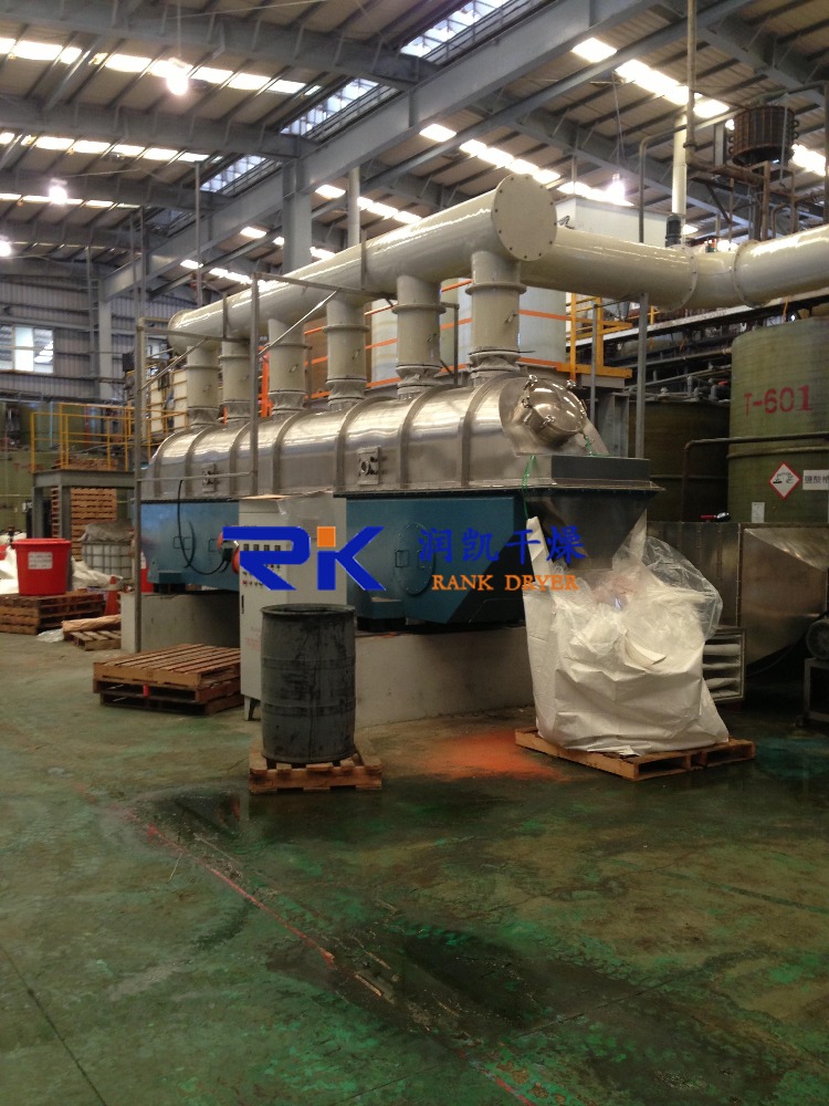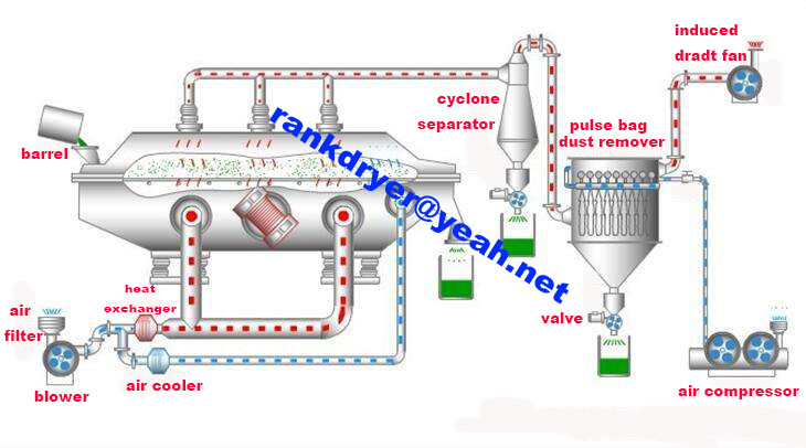 Raw material is fed into the dryer from the feeding end and moves forward continuously along under the function of vibration. The hot air penetrate fluid bed plate and dry damp raw material. Then the damp air is exhausted out through cyclone separator and dried raw material is discharged through discharge end.