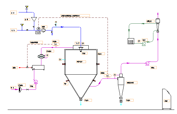 3. The production procedure is simple and the operational control is easy. The liquid with the moisture contents 40-60% (for special materials, the contents may reach 90%) can be dried into power or particle products once a time. After the drying, there is no need for smashing of sorting, so as to reduce the operation procedures in the production and enhance the purity. The product particle diameters, looseness and water contents can be adjusted through changing the operation condition in a certain scope. It is very convenient to carry out the control and management.