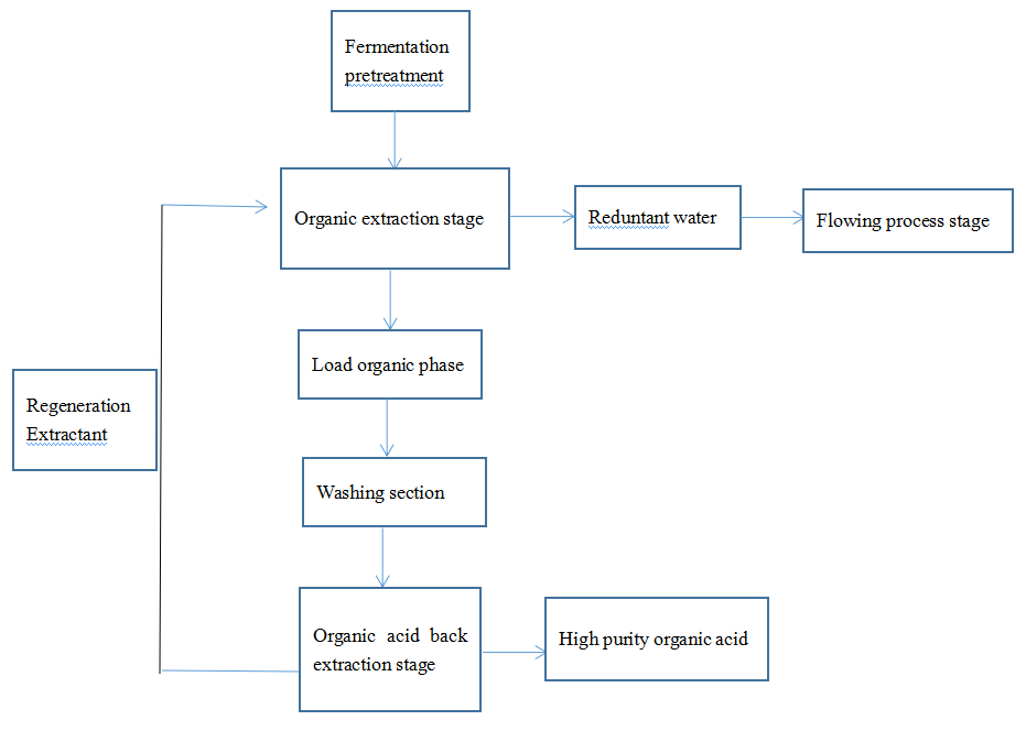 Solvent extraction technology used the differenct solubility in extraction system of separated component and other impurities, Citric acid was extracted to organic phase with extraction technology, and remove citric acid to aqueous phase with back extraction technology, back extraction liquor passed decoloring and enrichment of crystallization and get citric acid solid.