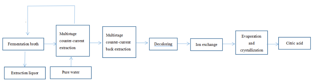 Solvent extraction technology used the differenct solubility in extraction system of separated component and other impurities, Citric acid was extracted to organic phase with extraction technology, and remove citric acid to aqueous phase with back extraction technology, back extraction liquor passed decoloring and enrichment of crystallization and get citric acid solid.