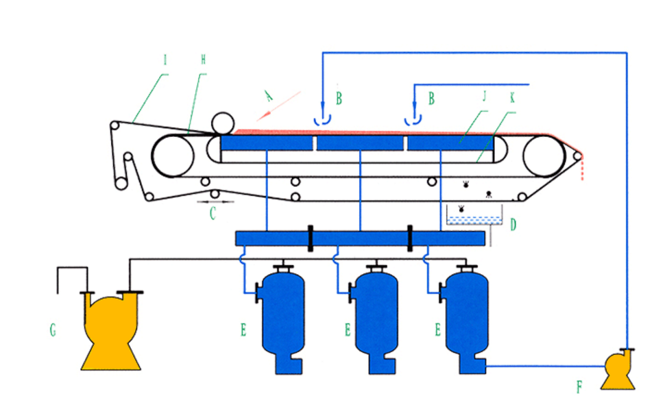 Step6: The filtrate and air in the vacuum box flow through filtrate pipe and a gas-water separator.