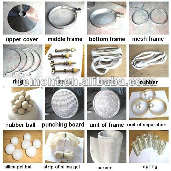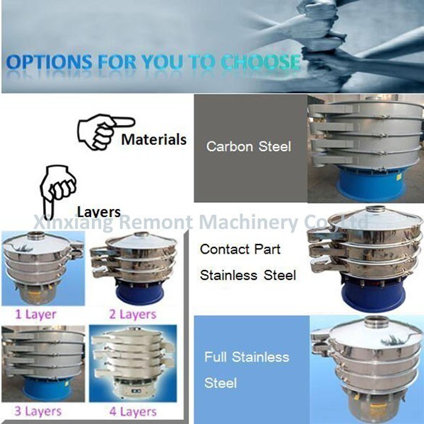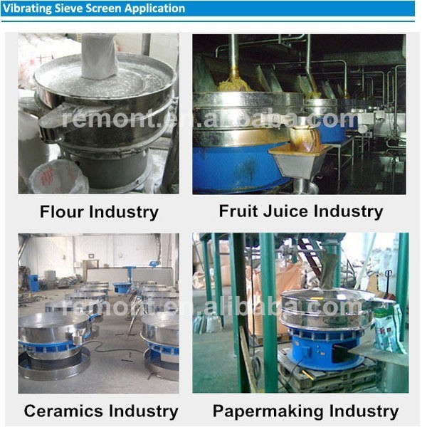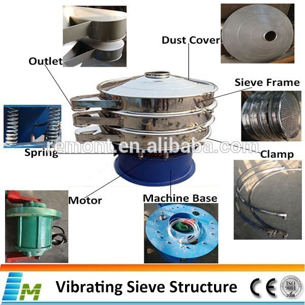 1, Function:Screening and filtering any powder or particle material 2, Diameter:400mm, 600mm, 800mm, 1000mm, 1200mm, 1500m, 2000mm 3, Movement Locus:Upwards, Left and Right Motion, Rotation Motion. 4, Sieve Layer: 1-5 Layers, the 1-3 layers is better. 5, Screen Size Range :10mm-500 mesh. 6, Driven Mode :Vibration Motor Driven. 7,Material:Carbon Steel, Material Contact Parts are Stainless Steel or full Stainless Steel. |