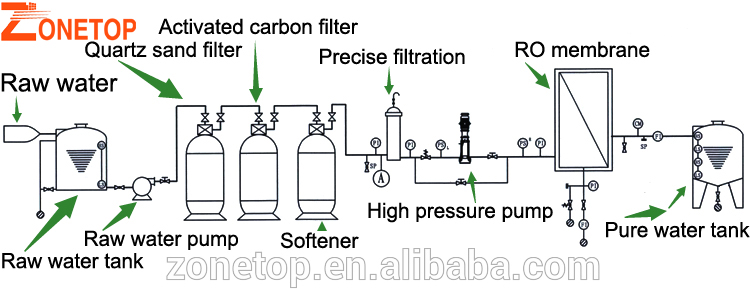 Raw water tank-raw water pump-multi-medium filter--active carbon filter -water softner (Sodium Ion Exchanger)-precision filter-RO mainframe(including chemical cleaning device)-ozone generator-finished product water tank