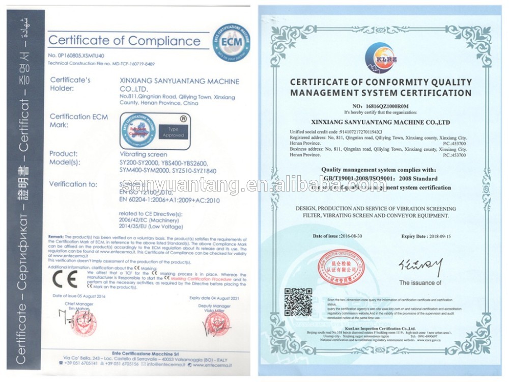 Xinxiang city Sanyuantang Machinery Co.,Ltd, ISO9001 certified enterprise, specializes in manufacturing series of vibrating screen and vibrating machine and we could design, develop and produce by ourselves.