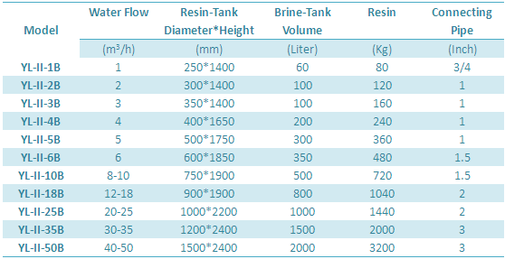 (2)Flow type:it adopts control of turbine flow or electronic flow sensor, when the yield of softener reaches pre-set flow it will automatically enter the regeneration condition, the same as time type then the valve will run the other resin tank and the former resin tank won’t work until the other tank is in the regeneration state.
