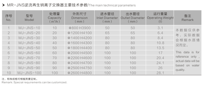 MR-JNS up-flow regeneration sodium ion exchanger is used to reduce the hardness of raw water. By removing calcium and magnesium ions in the water, soft water can be made. As it adopts the counter current regeneration technology(i.e.regenerated liquid flows in the opposite direction of water flowing during operation), so regenerant and resin can mix thoroughly. Therefore, it has a high output water quality, and low salt consumption (about 30% lower than that of concurrent regeneration one).