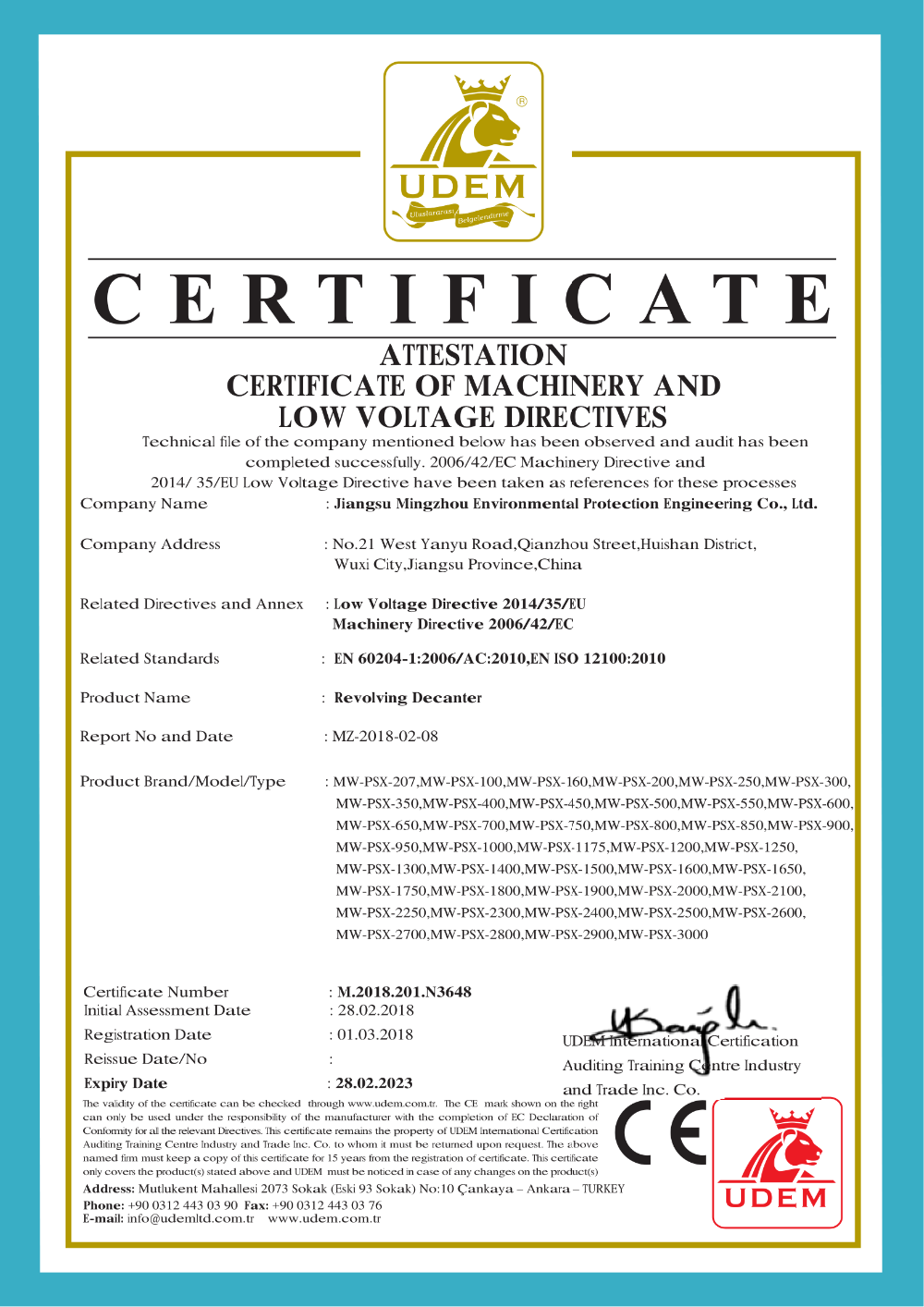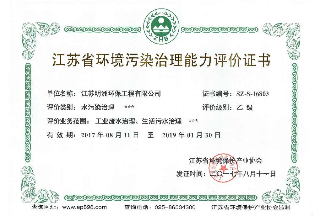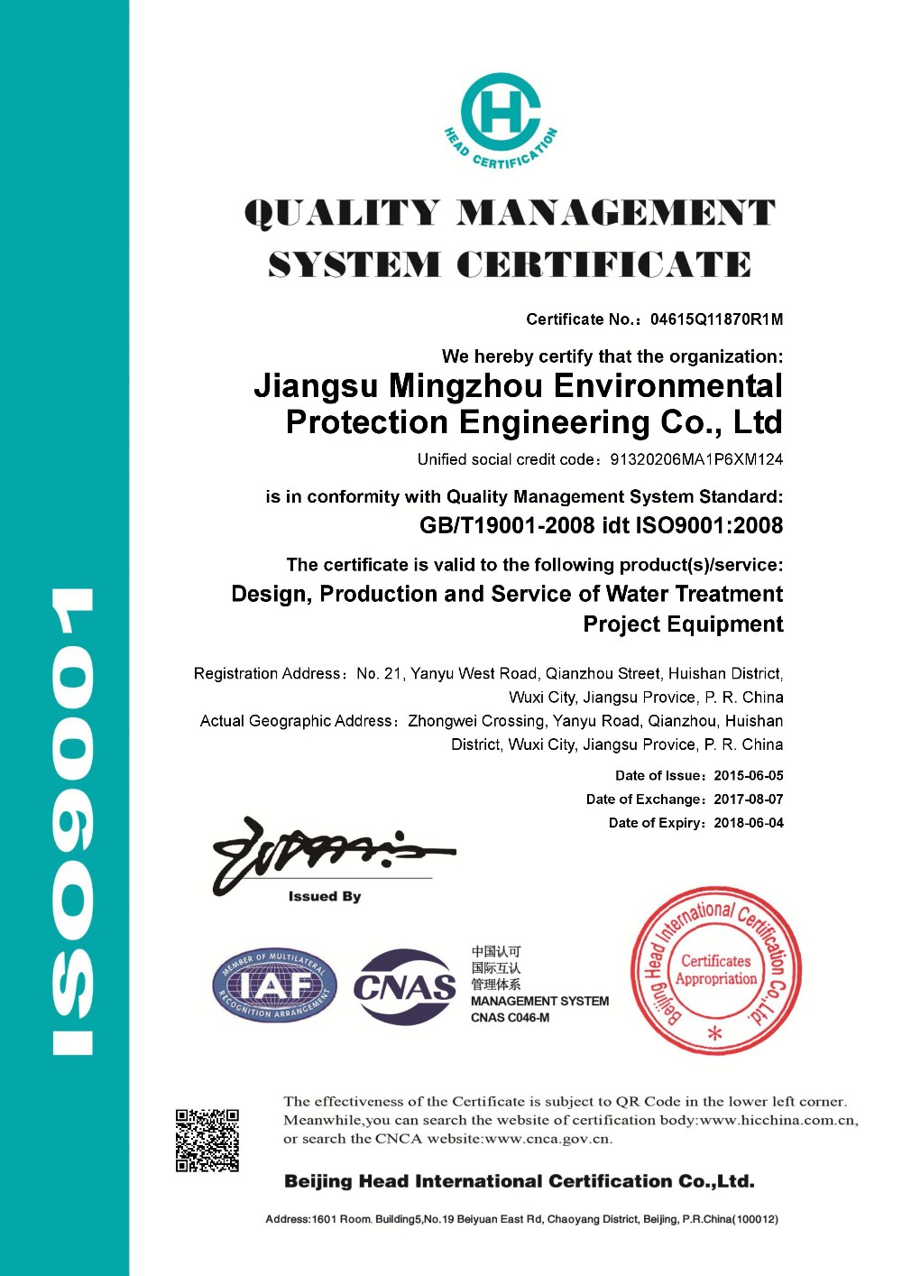 Jiangsu Mingzhou Environmental Protection Engineering Co., Ltd., formerly known as Wuxi Mingzhou Environmental Protection Machinery&Equipment Factory, is a well-known provincial level high-tech enterprise in water treatment industry, integrating scientific research development, production sales, and technical service together. In 2000, we passed the certification of ISO9001: 2000 Quality Management System.