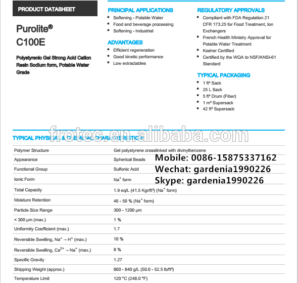 Purolite C100E Polystyrenic Gel Strong Acid Cation Resin Sodium form