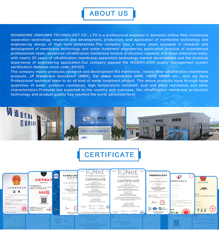 Hollow fiber ultrafiltration membrane is is made from macromolecule material with special process of asymmetric semi-permeable membrane.It is hollow capillary (or hollow fibrous), pipe wall with microporous, under the action of pressure, concentrate on the film outside or inside of the membrane flow, of small molecules through the membrane, after collecting and become a super filtrate, and one of the macromolecular substance (protein, enzyme, nucleic acid, polysaccharide, etc.) and colloidal particles (latex particles), bacteria and other trapped outside the membrane, liquid becomes, thus achieve the goal of physical separation, enrichment and purification.