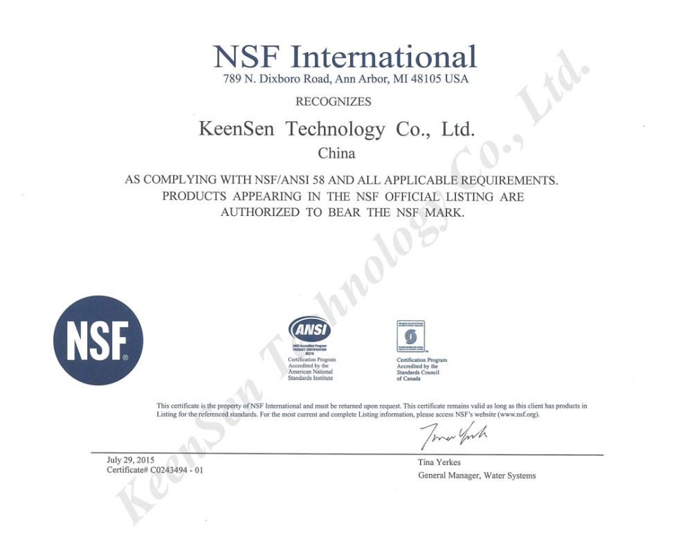 A: All products meet ISO9001 standard, Besides, KeenSen membranes all certificated NSF58/ANSI.