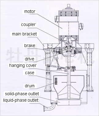Top suspension centrifuge mainly consists of electric motor, rotating system, frame, casing, brake, sugar brake, purging, washing and electric control systems. In terms of the structure, the transmission is placed on the top and shaft coupling. The drum (a thin-walled metal cylinder with many liquor drainage holes on it) is fixed at the bottom end of the main shaft, and the top end of the main shaft is suspended inside the spherical bearing chamber by means of a single row of centripetal thrust ball bearings and cylindrical roller bearing, with the spherical surface supported by the bearing chamber seat and in between the spherical surfaces there is a sliding pad (teflon) for antifriction. Such a set of rotating system is fixed on the frame. Between the bearing chambers, there is the rubber buffer to form a kind of flexible support. During the operation of the drum, in case the disturbing force should be generated due to the imbalance of the material, the spherical surface of the bearing chamber could slightly swing, and by means of the damping effect of the rubber buffer, the swinging amplitude of the main shaft rotating is controlled to a certain extent. Meanwhile, the damping effect of the buffer absorbs part of the vibrational energy, realizing better vibration reduction. Thanks to the flexible structure of the main shaft system, automatic centering can be realized during the high-speed operation, ensuring smooth running as well as the safety and reliability of the machine. The operation principle of the top suspension centrifuge is: to pour the suspension liquid to be separated into the drum; during high-speed rotation, the liquid is licked off from the drum under the action of the centrifugal force field, while the solid granules are retained inside the drum by the filter screen and thus the solid-liquid separation is realized, top suspension centrifuges can be divided into the following two major categories: For relatively fine solid granules with compact texture, cylindrical drum is adopted, and the material can be scraped off the drum's wall by means of the radia and axial motions of the scraper to accomplish the process of material discharging. This type of centrifuge is known as Model XJZ. For coarse granules with loose texture, conic drum is adopted, and by means of immediate stop at the low speed of drum, the material is made loose by inertia and discharged by gravity. This type of centrifuge is known as Model XZ. | ||||||||||||||||||||||||||||||||||||||