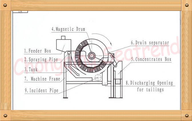 The material evenly to the cylinder upper magnetic field is rotating by electromagnetic vibration feeder, magnetic substances are adsorbed on the surface of the cylinder, and the cylinder to rotate together. Because the magnetic particles and non magnetic particles in the magnetic field, the magnetic force, magnetic particles adsorbed on the surface of the cylinder by the magnetic force in magnetic field, magnetic field to the fee is unloaded, non-magnetic and weakly magnetic particles due to their different magnetic force, leave trace is different. Magnetic stronger off Vietnam near the drum. Around the direction of the alternating magnetic field, and in a certain angle and periodic oscillation, magnetic material in magnetic field from the materials do roll swing on the surface of the roller.