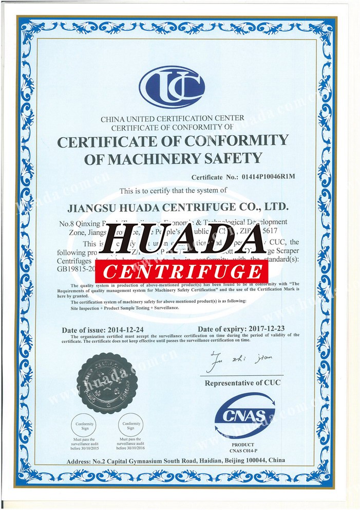 Huada is a member of Technical Committee for Standardization of Chinese Separation Machinery, a vice president of Separation Machinery Branch of China General Machinery Association, a drafter of national and industrial standards on centrifuges, a high-tech enterprise in Jiangsu Province and a key high-tech enterprise for national torch plan. In 1998, our centrifuges acquired national safety certification. Huada is one of enterprises in domestic filtration and separation machinery industry which is the largest in scale, the most complete in product varieties and series, the most competitive and the most influential.