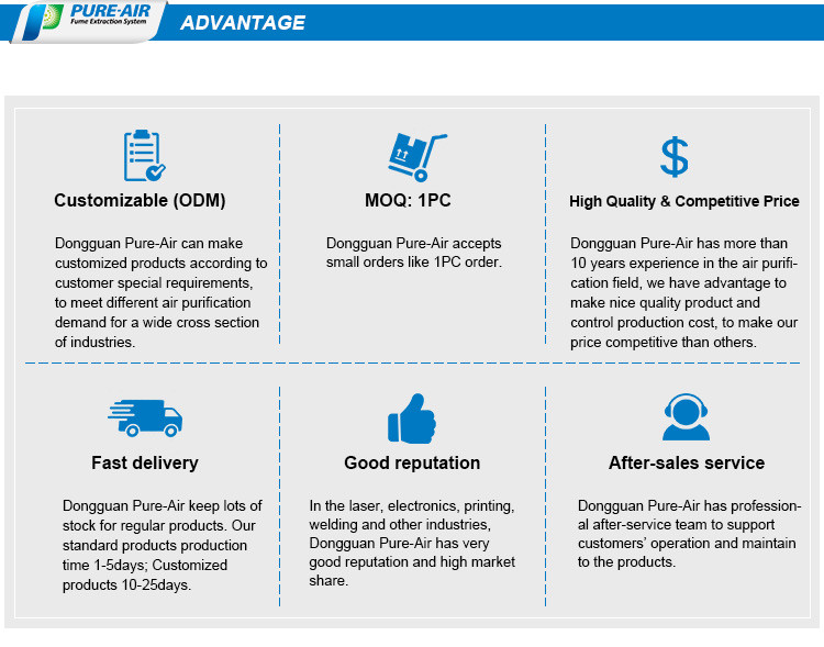 Dongguan Pure-Air Tech Co., Limited has well expertise in the field of fume extraction, dust collection and oil mist purification. With more than 10 years experience, we can offer different fume extraction systems, dust collectors, oil mist filters to meet our distributors and end users demands. Also we have full experience in manufacturing customized products. Pure-Air Fume Extraction System, Selling well more than 60 countries worldwide!