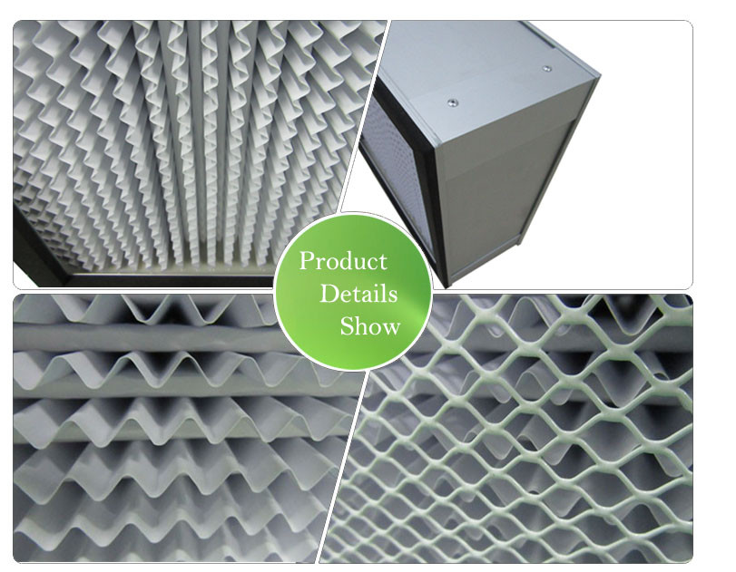 Adopting the superfine fiberglass filter paper or PP high efficiency filter paper as the media,separated by folded glue paperboard,aluminum foil,sealed by the new polyurethane sealant.low loss,high efficiency,light weight,it is tested precisely one by one.