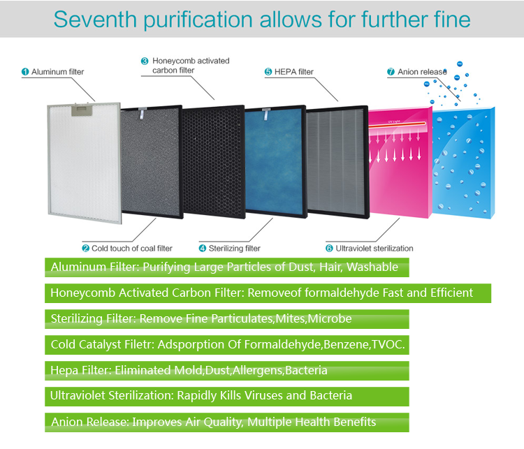 Filter | 1. Aluminum Filter (washable) 2. Cold Catalyst Filter 3. Antibacterical Filter 4. Honeycomb Activated Carbon Filter 5. High Efficiency Hepa Filter | ||