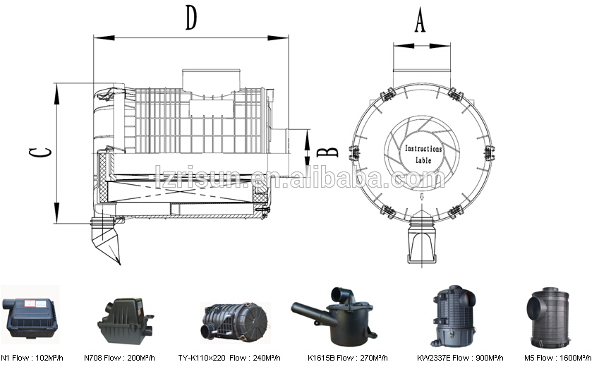 | Risun model | OEM No. | Flow M³/h | A(mm) | B(mm) | C(mm) | D(mm) | Application |