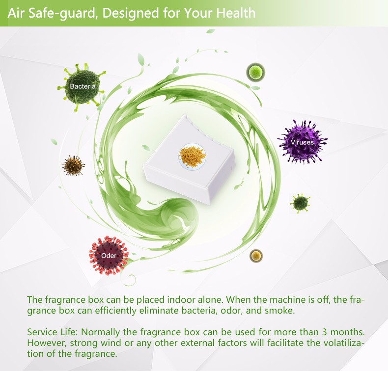 More than 20 kinds of degerming herbs that are recorded in “Compendium of Materia Medica”(Chinese traditional medicine research records) are processed into volatile solid PM(particulate matter). The PM gives off delicate plant fragrance, which effectively realizes a broad degermation, removes smoke and unwanted odor, and gives the air the aroma of a SPA.