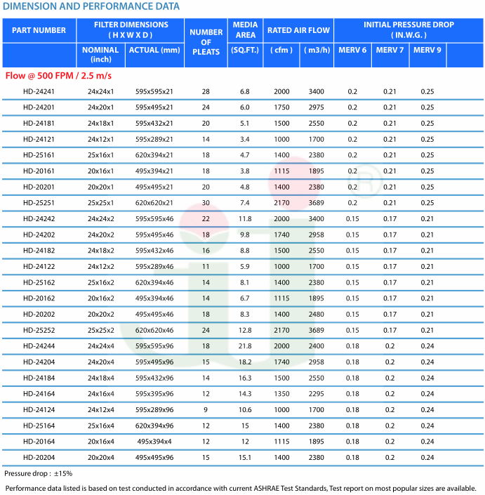 | Model | Dimension(mm) W*H*D | Rated Air Flow (m3/h) | Initial Resistance(pa) | Efficiency % | Class EN779 | Frame | Media | Protective nets |